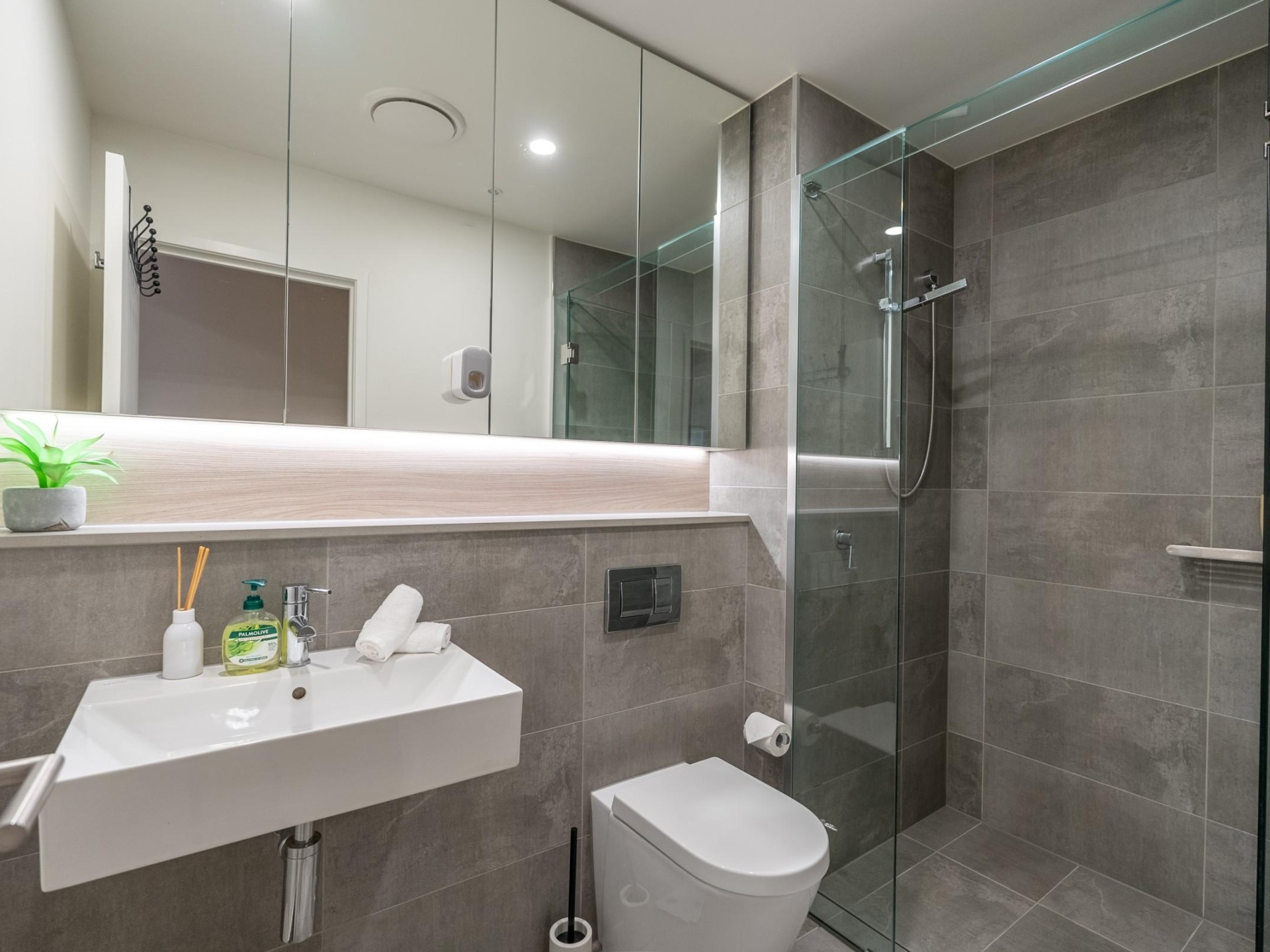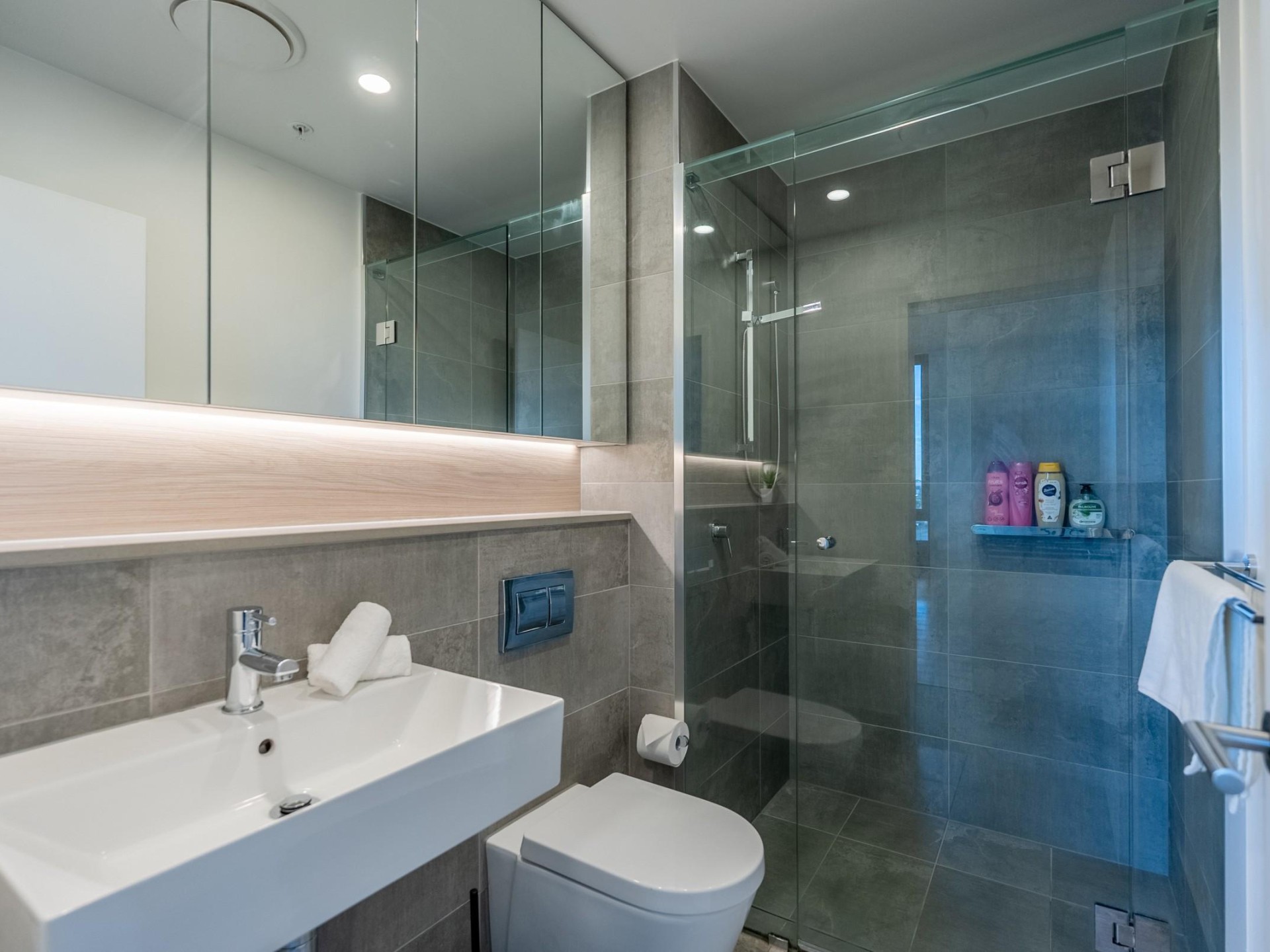 Stylish Bathrooms: Two sleek bathrooms with modern fixtures and fittings.