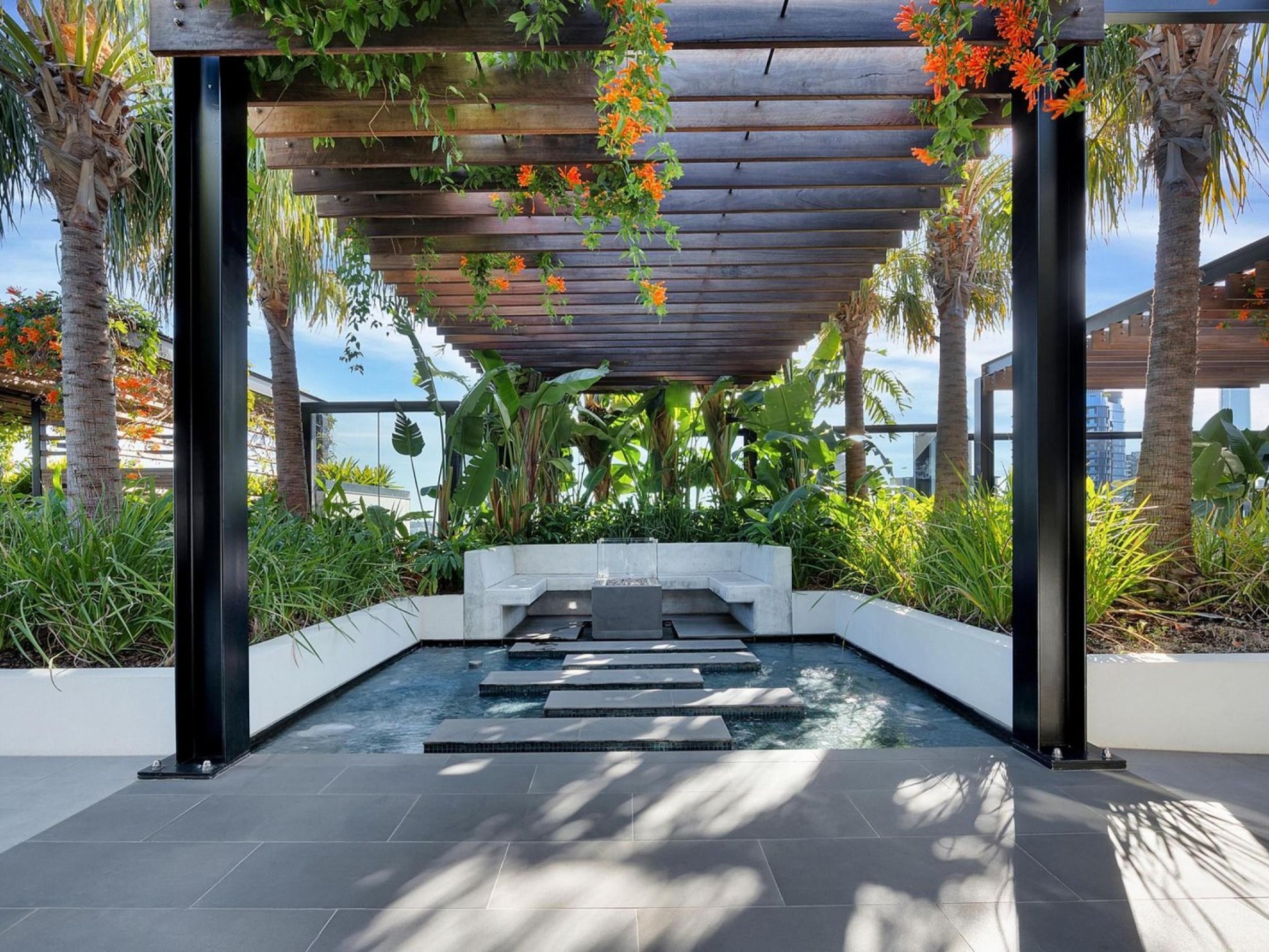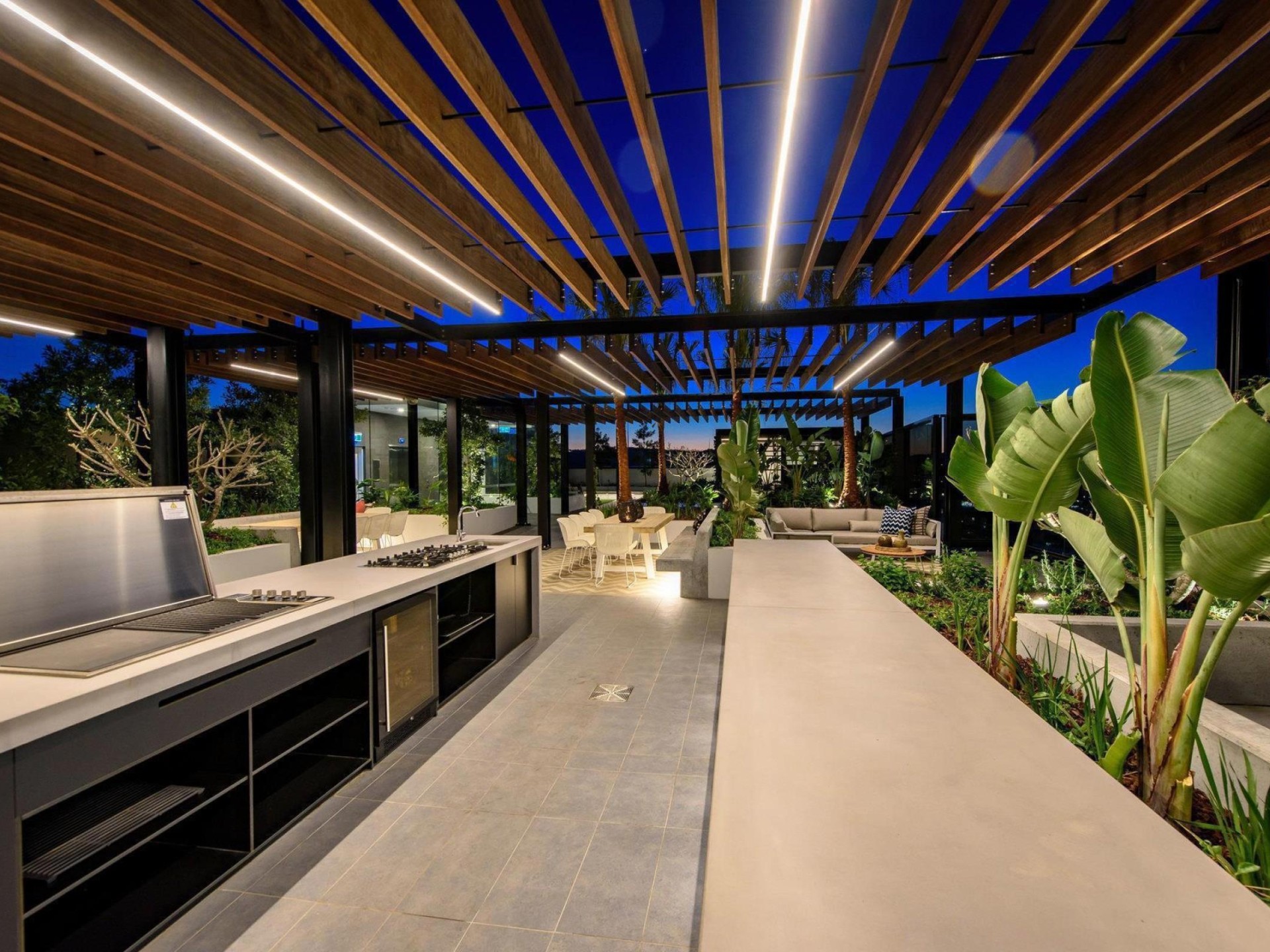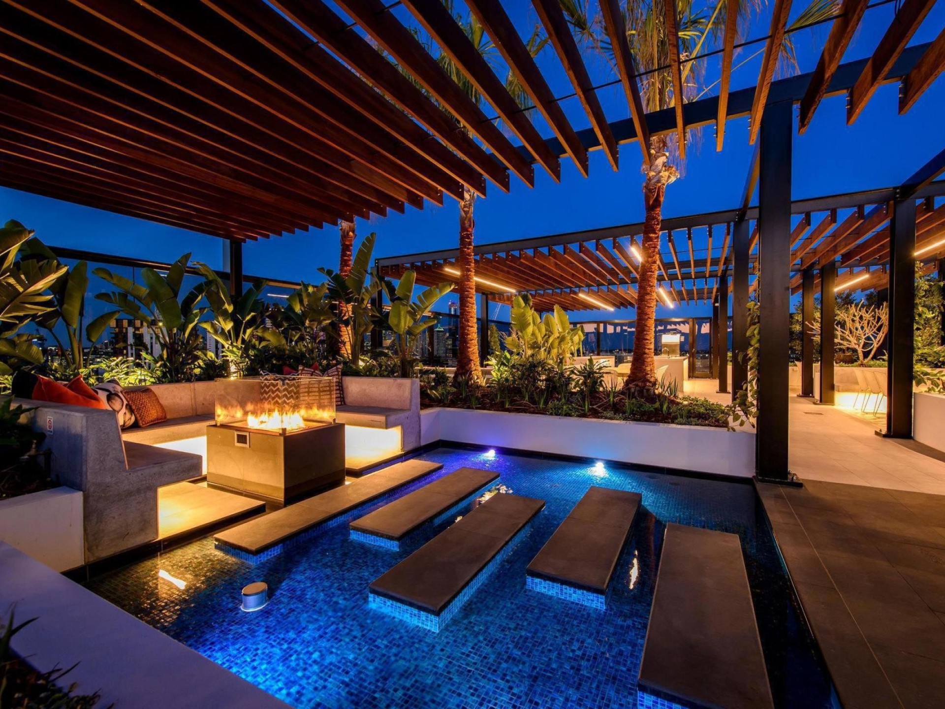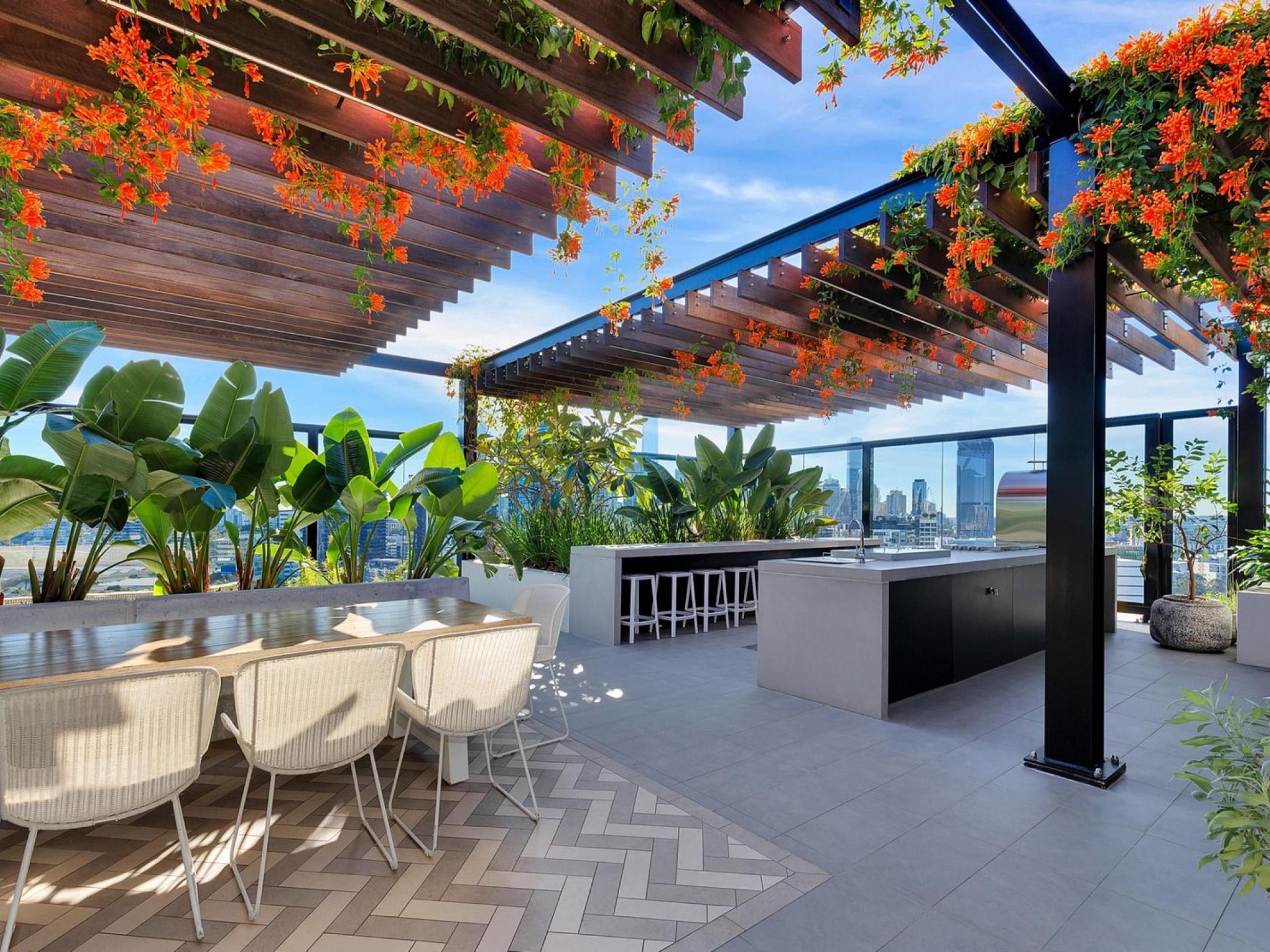 Rooftop Terrace: Panoramic city views with teppanyaki grill, BBQ, pizza oven, bar fridge, and dining tables.